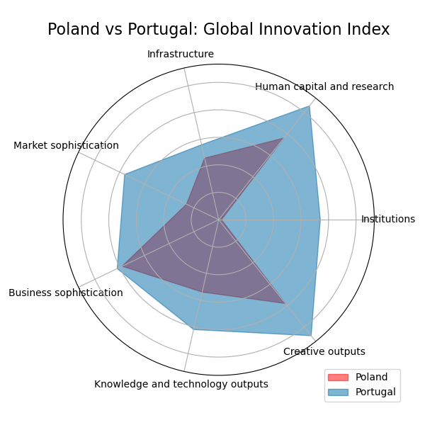 Portugal scores higher in all dimensions, with a well-balanced profile despite relatively weak infrastructure and institutions.